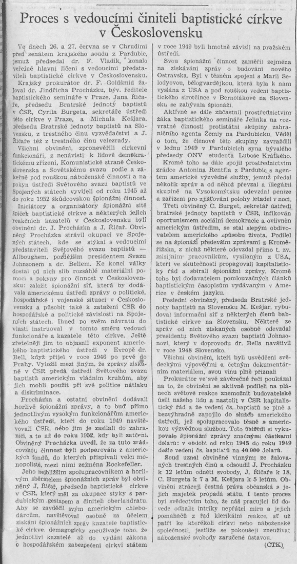 Krajský prokurátor dr. F. Goldšmid žaloval dr. Jindřicha Procházku, býv. ředitele baptistického semináře v Praze, Jana Řičaře, předsedu Bratrské jednoty baptistů v ČSR, Cyrila Burgeta, sekretáře této církve v Praze, a Michala Kešjara, předsedu Bratrské jednoty baptistů na Slovensku, z trestného činu vyzvědačství a J. Řičaře též z trestného činu velezrady.
